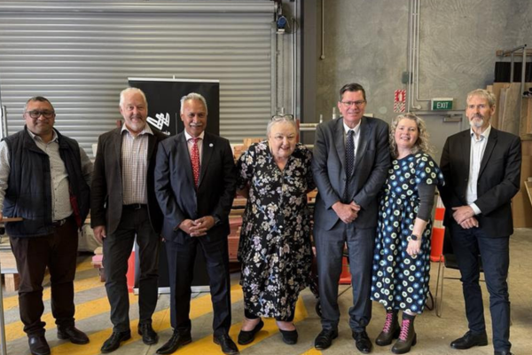 From left: Lee Hunter (Te Āti Awa), Matt Fairweather (Alliance Project Director), Lower Hutt Mayor Ken Laban, Hutt City Council CEO Jo Miller, Hutt City Council Economy & Development Director Jon Kingsbury, Dr Leanne Ivil (Weltec/Whitireia), and Neil McDonald (Weltec/Whitireia).