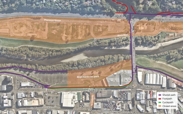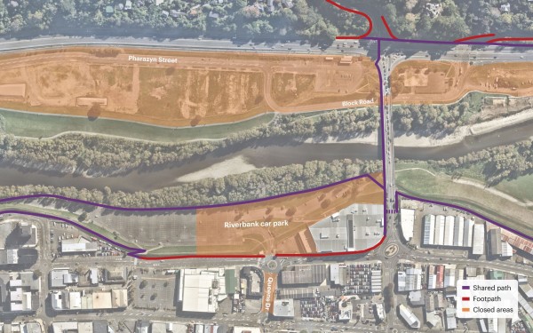At the same time, Wellington Electricity will be relocating cables on Rutherford St, this work is estimated to be completed by late February 2026. Whilst these works are being undertaken, the shared path alongside the river will remain open between Melling Link Bridge and Ewen Bridge, with pedestrians also able to use the existing footpath on Rutherford St. This is illustrated on the map below.