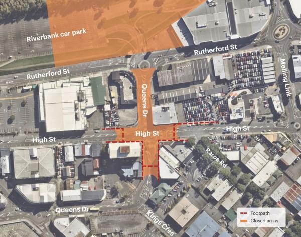 Access to businesses and residences will be maintained at all times and pedestrians will still be able to move around the area, as highlighted by the dashed red lines on the map below. Some parking outside of McDonald’s and 330 High St will need to be removed. The bus stops outside Burger King/Armstrong’s on High Street are being temporarily relocated to Cornwall Street. Metlink will share more information on this soon.