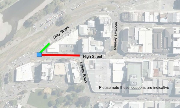- during Stage One, access to Daly Street will only be available from the south. From there you can continue north on Daly Street, or turn right onto Andrews Avenue and right or left again to High Street